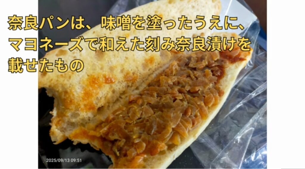 奈良漬けをマヨネーズで和えた「ならパン」。私は、奈良漬けが嫌いだが、このパンは別物だ。独特の癖になる味に仕上がっている。一度ご賞味あれ!