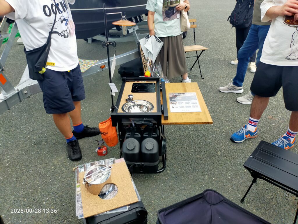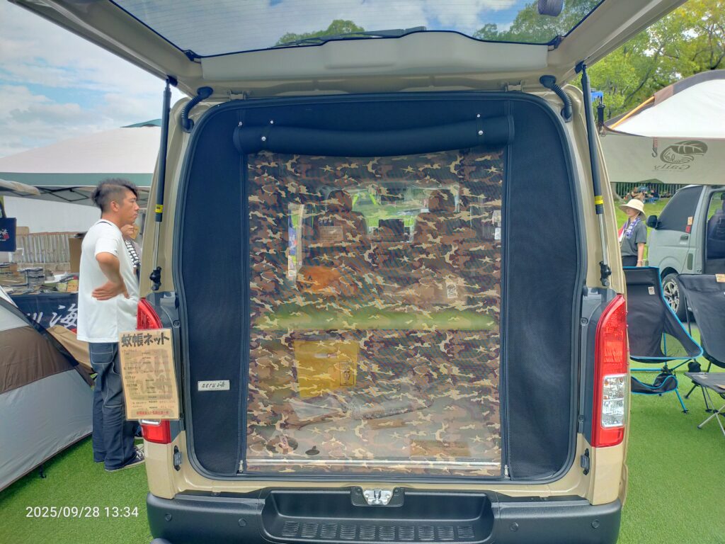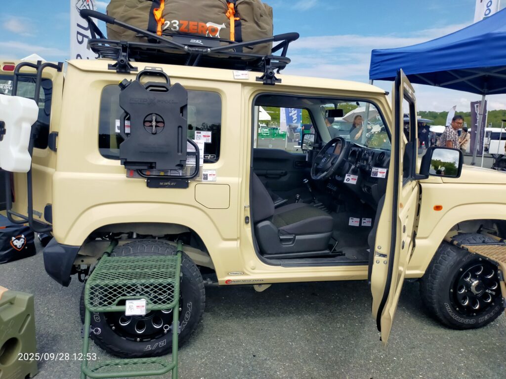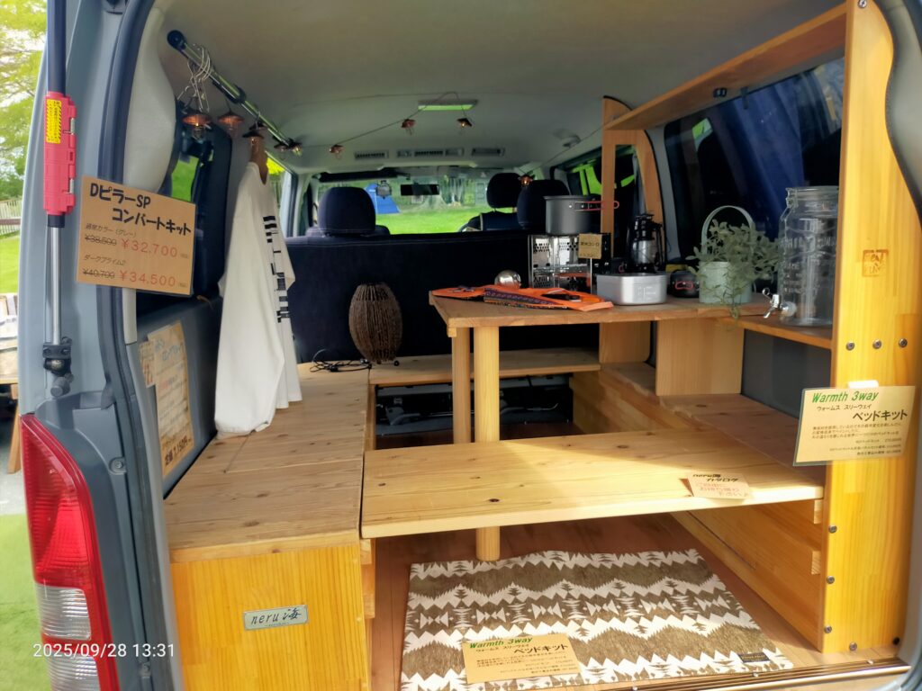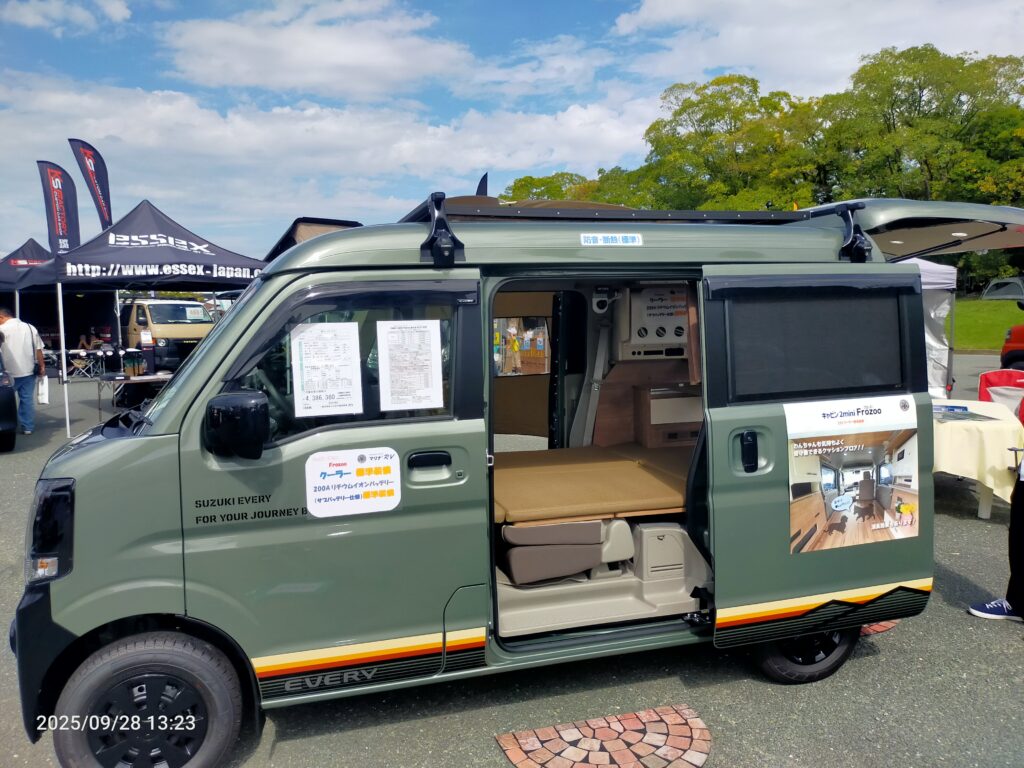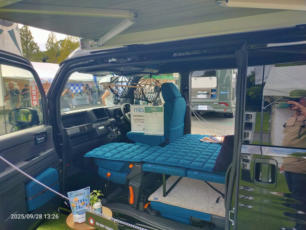 もう一つの目玉がエブリィキャンパーとN-BOXの軽キャンピングカー。軽でも、広くて間口の開放感は半端ない。最近は、軽でも小型の12Vエアコンは標準で付いている。